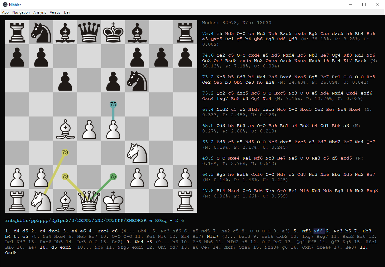 Being designed specifically for Lc0 means it can use the sort of information Leela provides that other engines don’t (or can’t). For example, Leela is always giving opinions about multiple different moves, and so Nibbler shows several possibilities graphically.